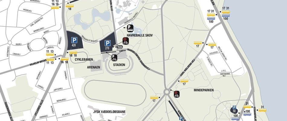 Der er masser af muligheder for transport og parkering, hvis du fx skal på stadion, i Tivoli Friheden eller en tur i Mindeparken.