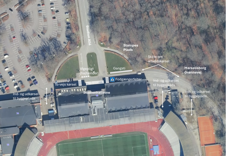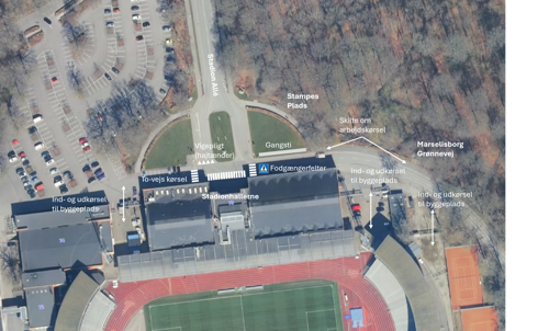 Der er tung trafik med mange lastbiler og maskiner ved byggepladsen for det nye stadion i Aarhus. Hold øje med den nye skiltning og opstregning i området, som skal øge trafiksikkerheden for særligt de gående. Er du i bil, så overvej en anden vej og undgå kø.