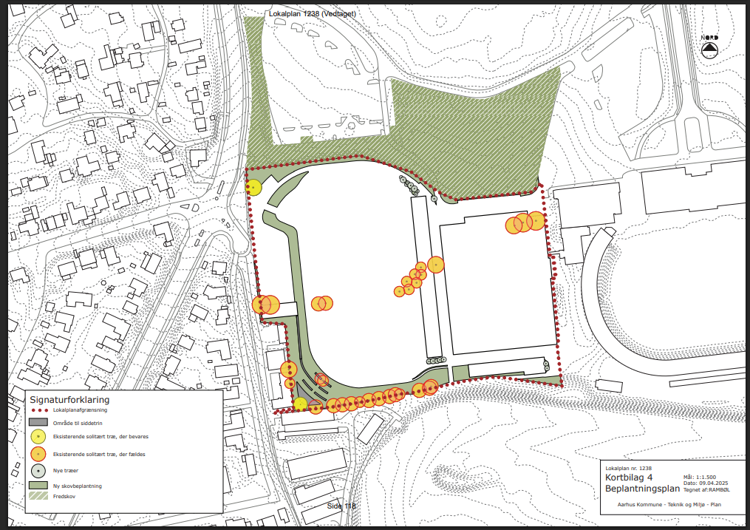 Se nedenstående beplantningsplan fra lokalplanen, som både viser, hvor der fældes og bevares solitære træer, samt hvor der etableres nye træer og beplantning. Træerne på billedet ovenfor markeret med rødt/hvidt bånd bliver bevaret.