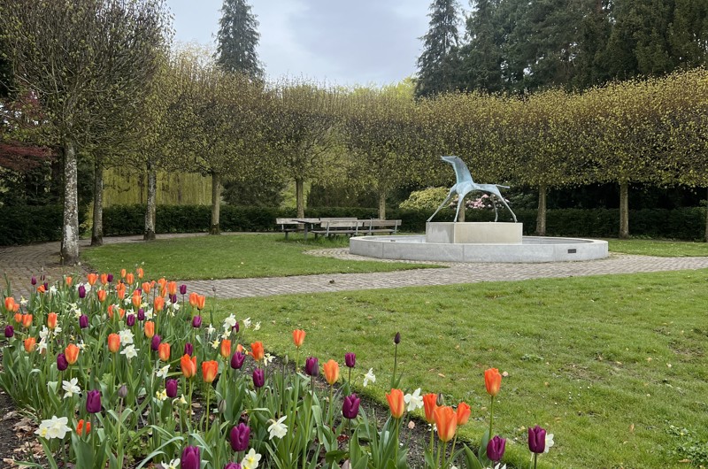 De farvestrålende bede med både kendte og sjældne blomsterarter omgiver et 220 m2 stort vandbassin. Med tiden er der kommet forskellige statuer og mindesmærker til, såsom en mindesten med bronzerelieffer over Christian og Severine Rømer (datter af Hans Broge) og Solhesten af Valdemar Foersom Hegndal samt Johannes C. Bjergs Danaide.