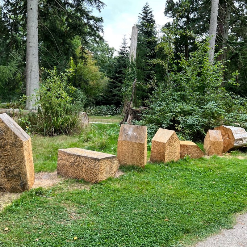 I Forstbotanisk Have har billedkunstneren Jørn Rønnau lavet et skulpturelt forløb af seks husformer skabt i et stort vindfældet californisk redwood-træ.