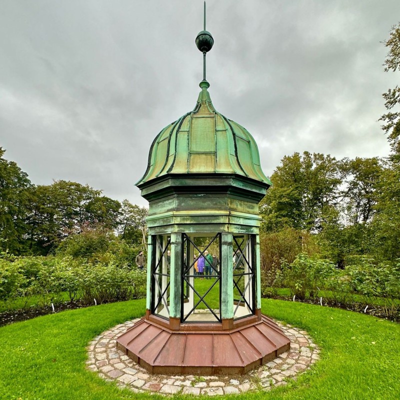 At the western end of the palace garden, in the middle of a rose bed, stands a spire with a copper roof.